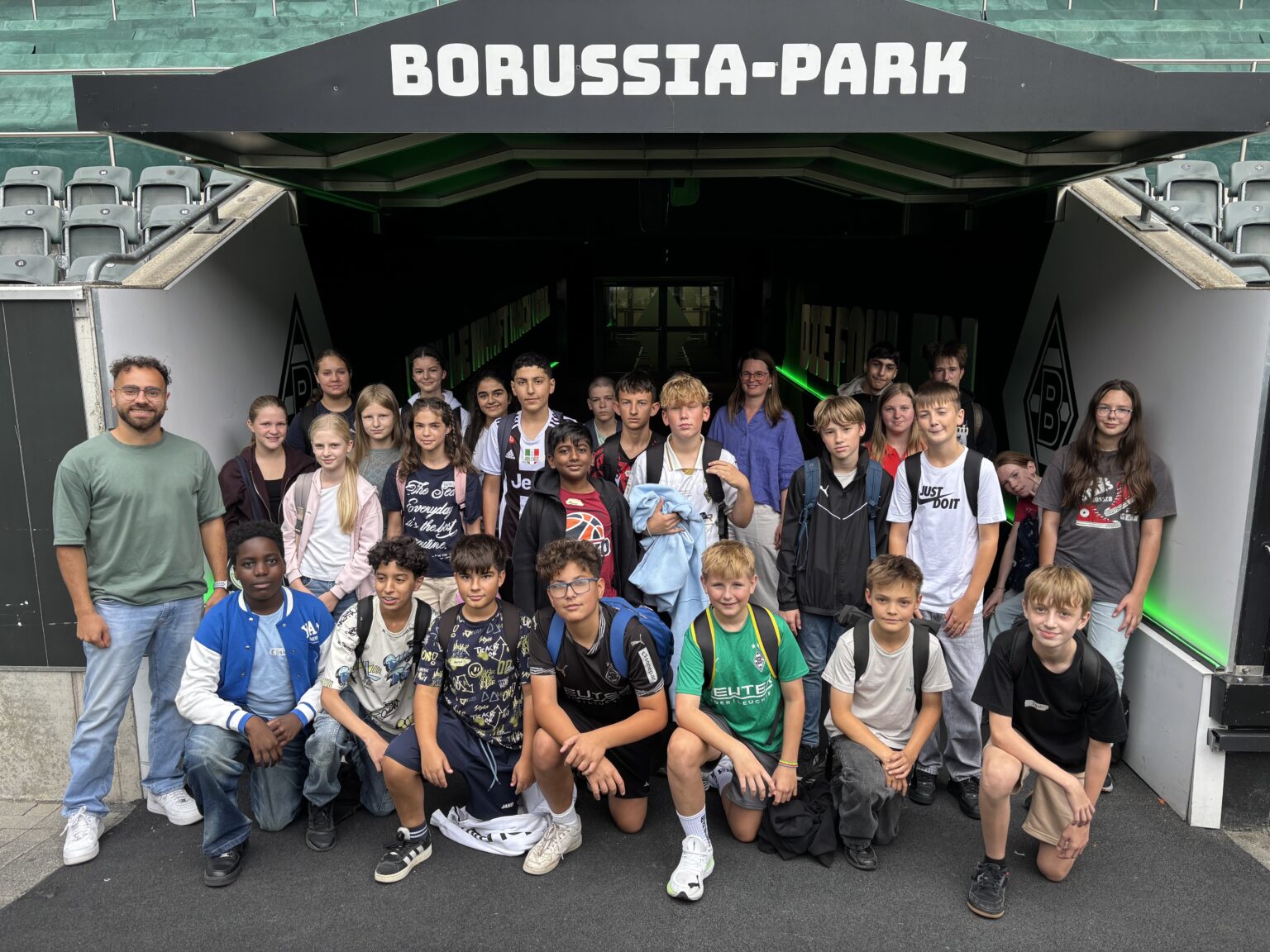 Am Donnerstag, den 28.08.2025, unternahm die Klasse 7c gemeinsam mit Frau Gräfen und Herrn Sezgin einen Ausflug zum Workshop „Rudelbildung“. Ziel des Tages war es, die Klassengemeinschaft durch verschiedene Kooperationsspiele und Teamaufgaben zu stärken. Die Schülerinnen und Schüler wurden dabei vor spannende Herausforderungen gestellt, die sie nur gemeinsam meistern konnten. So standen Zusammenarbeit, Kommunikation und gegenseitiges Vertrauen im Mittelpunkt. Alle beteiligten sich aktiv und hatten viel Freude daran, die Aufgaben als Team zu bewältigen. Zum Abschluss gab es noch eine besondere Überraschung: eine Stadionführung im Borussia-Park. Dort konnten die Schülerinnen und Schüler einen Blick hinter die Kulissen werfen und spannende Eindrücke vom Stadionalltag gewinnen. Der Ausflug war für alle ein gelungenes Erlebnis, das nicht nur Spaß gemacht hat, sondern auch das Zusammengehörigkeitsgefühl der Klasse gestärkt hat.