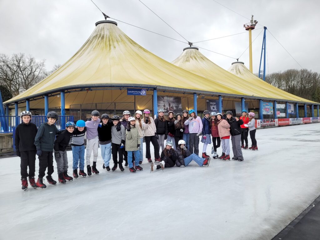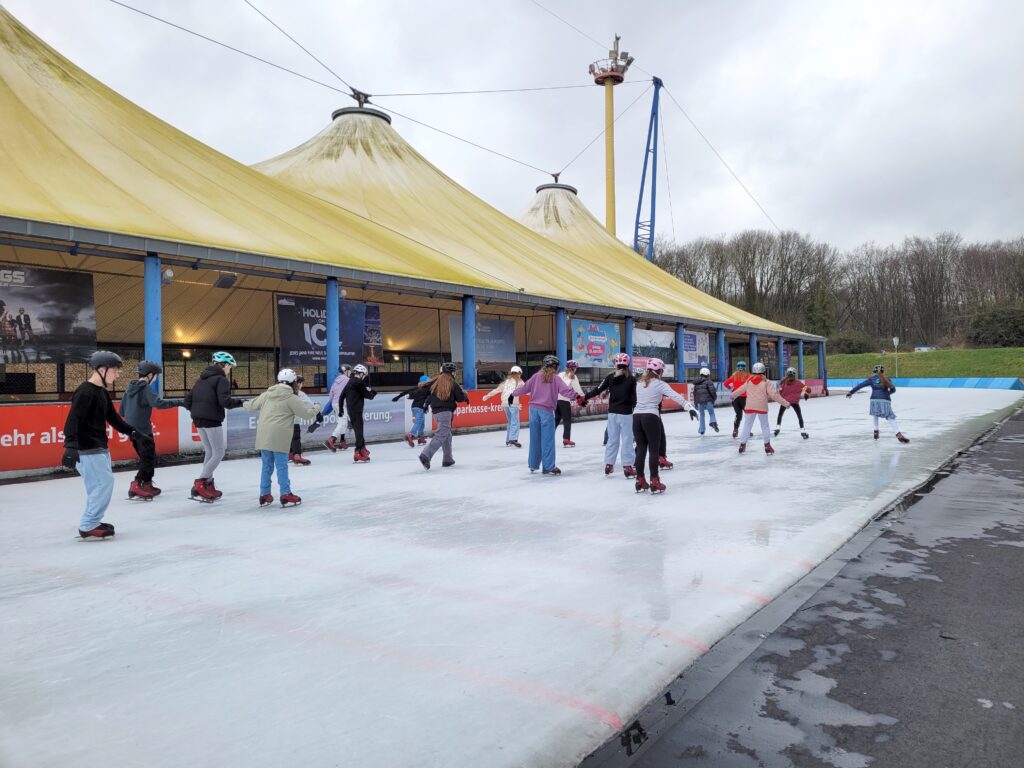 Am Montag, den 19.02.2024 wurde die 7a von Herrn Fritsch und Frau Fretz ganz schön aufs Glatteis geführt – im Eisstadion Grefrath übten sich die Schülerinnen und Schüler und Frau Fretz erstmalig oder weiter im Schlittschuhlaufen. Auch wenn es bei einigen zunächst eine Rutschpartie war und einige Hintern nass wurden, steigerten sich doch alle im Laufe des Tages und hatten bei Herrn Fritsch eine sichere Anlaufstelle. Besonders gefallen hat uns die letzte Stunde, in der wir die gesamte Anlage nur für uns hatten. Hungrig und stolz über die Fortschritte wurde der Tag mit Pommes und einem Besuch auf dem nahegelegenen Spielplatz beendet – mit weniger glattem Boden, auch wenn der Matsch für einige nicht so weit vom Eis entfernt war.