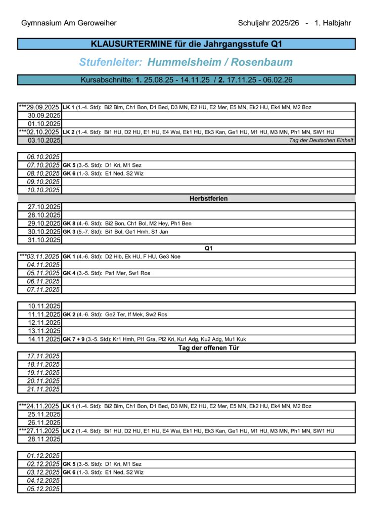 Die Klausurtermine der Jahrgangsstufen EF, Q1, Q2 für das laufende Schulhalbjahr sind nebenstehend verlinkt. Weitere jahrgangsstufenbezogene Informationen, Antragsformulare und Unterlagen zu LuPO sind sortiert unter Formulare.