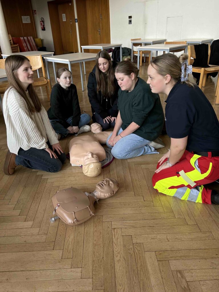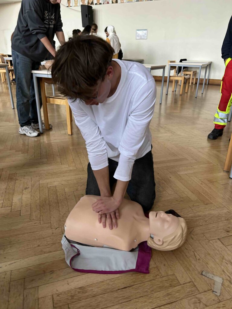 Zu Beginn erhielten die Schülerinnen und Schüler einen informativen und anschaulichen Vortrag von Herrn Dr. Deußen. Dabei erklärte er nicht nur die grundlegenden Schritte der Reanimation, sondern ging auch auf die physiologischen Hintergründe ein: Warum ist eine schnelle und richtige Herzdruckmassage so entscheidend? Und wie funktioniert eigentlich ein automatischer externer Defibrillator (AED)? Die gelungene Mischung aus medizinischem Fachwissen und verständlichen Beispielen sorgte für große Aufmerksamkeit und viele interessierte Rückfragen.