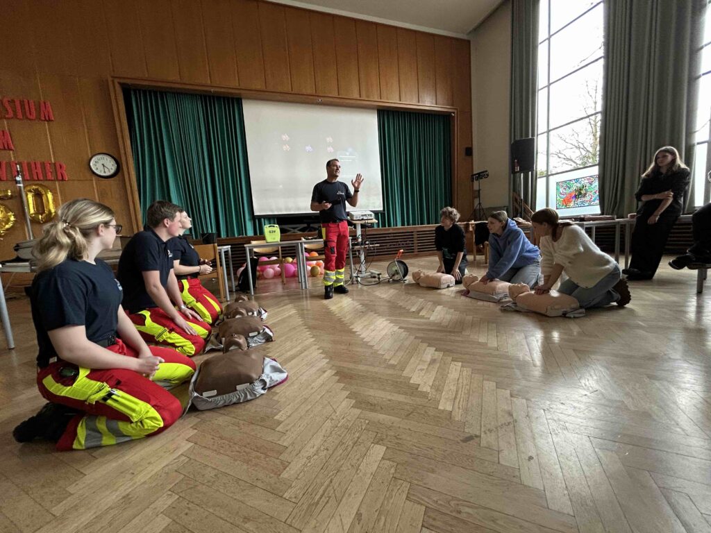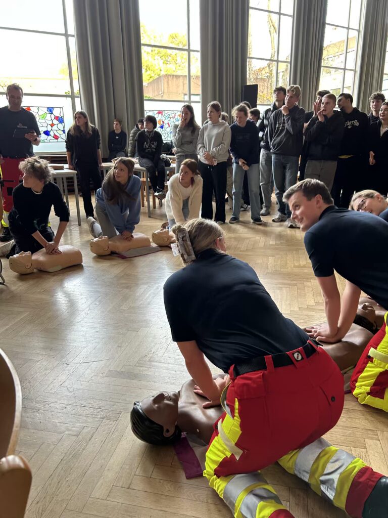 Am Montag, den 10.11.25, hatten unsere Schülerinnen und Schüler der EF und Q1 die besondere Gelegenheit, an einem umfassenden und praxisnahen Reanimationstraining teilzunehmen. Unter der fachkundigen Leitung von Dr. Deußen und seinem engagierten Team wurde den Jugendlichen vermittelt, wie wichtig und gleichzeitig gut erlernbar lebensrettende Maßnahmen sind.