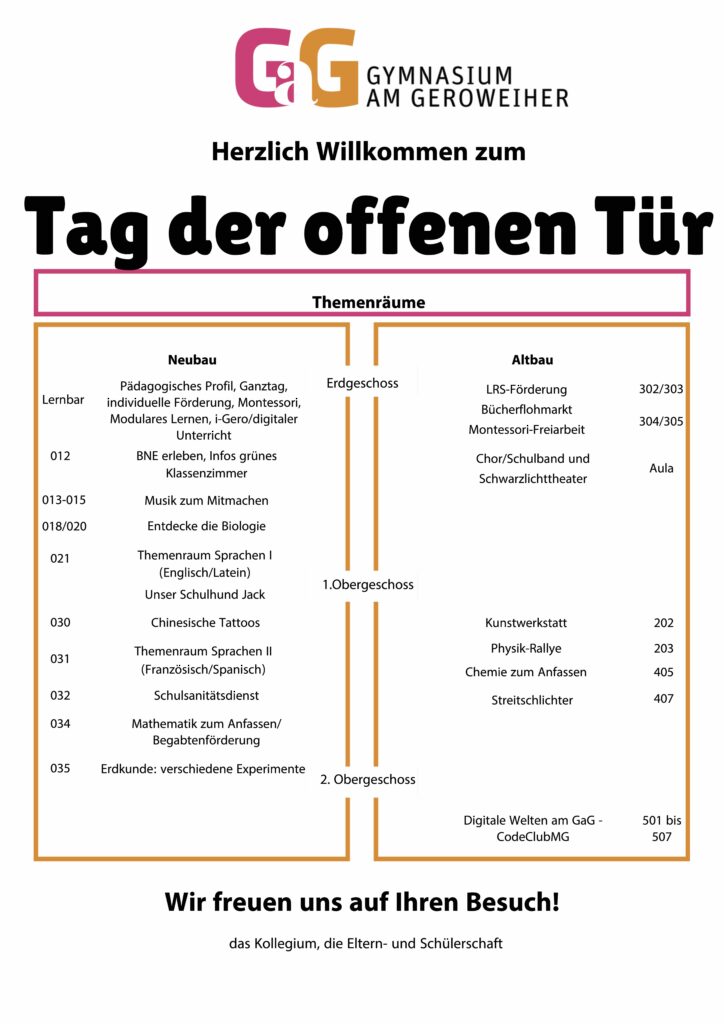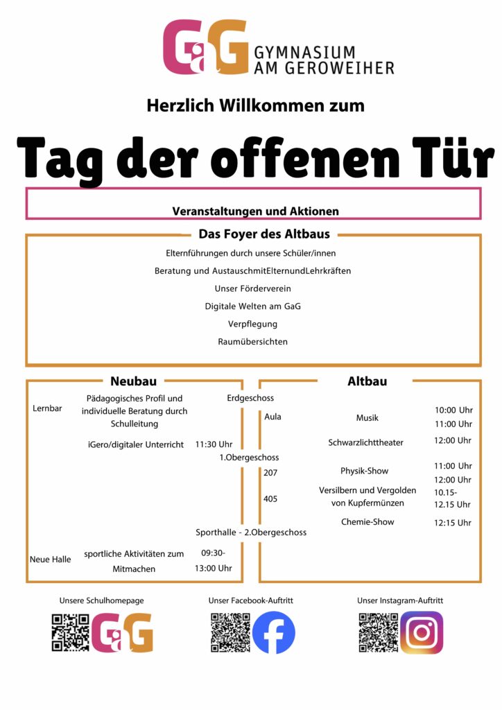 Das Gymnasium Am Geroweiher lädt Sie und Ihr Kind herzlich zum Tag der offenen Tür ein: am 15. November 2025 von 9.00 – 13.00 Uhr sind für Sie die Türen geöffnet, und zwar zum „Mitmachen und Entdecken“. Zentrale Informationen rund um unser Gymnasium gibt es durchgängig in unserer Lernbar.